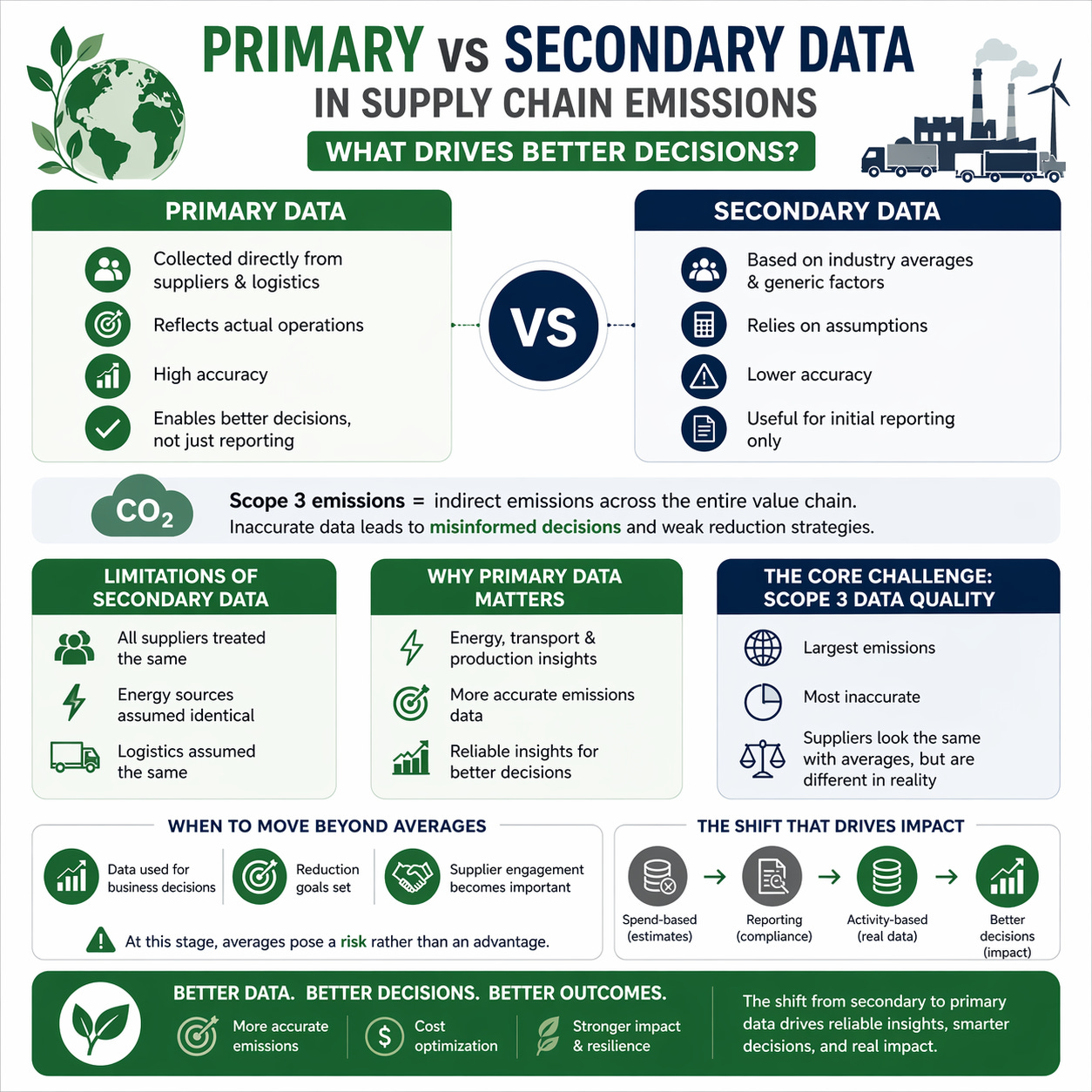Primary data is collected directly from suppliers, manufacturers, and logistics partners, reflecting actual operations. Secondary data relies on industry averages and estimates, which may not capture real-world variations. This difference directly impacts the accuracy of Scope 3 emissions calculations.